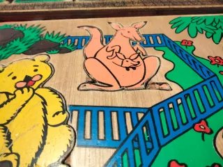 Puzzle antiguo de madera de la marca Educa. Puzzle en madera fina de composicion y encaje, es usado en perfecto estado y completo, con todas sus piezas, como se ve en las fotos. - Juego de composición y encaje. - Ilustración de un jardín con animales y flores.
