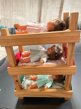 Litera de juguete de madera con un diseño colorido y divertido. - Estructura de madera. - Detalles pintados en rojo, verde y azul. - Incluye un pequeño colchón con estampado. - Adorno de luna y estrella en el cabecero. - 3 muñecas (las 3 bessones) -Antiguo/coleccionista