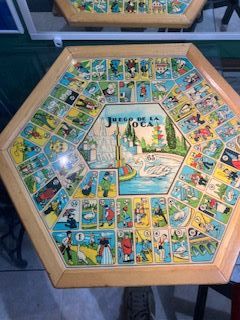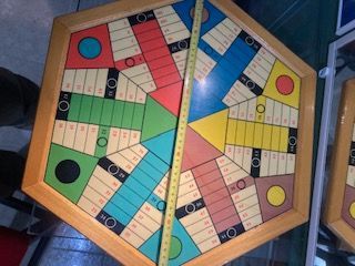 Juego de mesa clásico que combina Parchís y Oca, con un diseño vintage y antiguo. Tiene muchísimo tiempo - Tablero hexagonal con múltiples casillas. - Diseño colorido con diferentes zonas de juego. - Marco de madera.