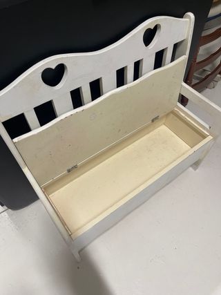 Banco baul infantil artesanal de madera con espacio de almacenamiento para juguetes, disfraces, etc. Vendo porque la niña es mayor. Necesita una mano de pintura. - Diseño blanco con detalles de corazones en el respaldo. - Ideal para habitaciones infantiles o zonas de juego. - Respaldo con barrotes verticales y forma ondulada. Recoger en El Viso de San Juan, Toledo. Posibilidad de acercarlo al sur de Madrid. Mas cositas chulas a la venta en mi perfil.