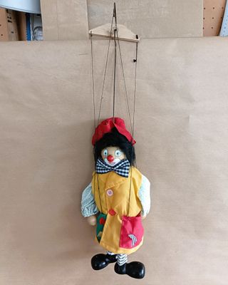 Marioneta de madera y tela con cinco cuerdas. Medidas: marioneta sin cuerdas 20 cm y con las cuerdas estiradas 42 cm. Tenemos más artículos interesantes. Cunas mecedoras estilo Thonet, sillas danesas Skaraborg, Bodafors, Thonet, Tapiovaara, espejo estilo veneciano, Art Decó, Gio Ponti, Limoges, Capeans, Vargas Segovia, Wedgwood, Káiser, lámparas industriales esmaltadas, Fase, flexos, maletas antígüas, costureros, Faroles antiguos.