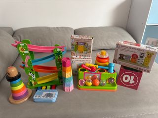 Conjunto de juguetes educativos y de entretenimiento para los más pequeños. Se vende junto o separado. - Cubo de actividades de madera con cuentas 20€ - Juguete musical VTech con animales 10€ - Bola de discoteca con luces 5€ - Juguete con diferentes caras y tambor con musica 15€