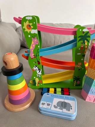 Lote de juguetes de madera y puzzles educativos para niños pequeños. Incluye un surtido variado para el aprendizaje y la diversión 4 euros la unidad. - Puzzles de animales de granja. - Puzzles de letras y números. - Puzzles de vehículos. - Juego de apilar aros.