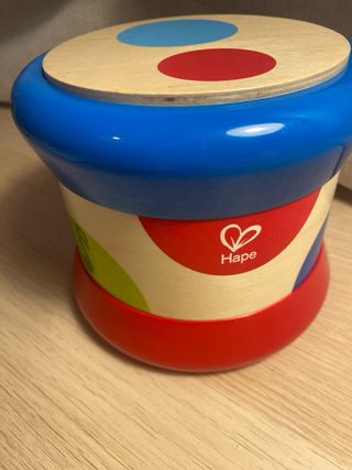 Tambor de juguete de la marca Hape, con un diseño colorido y divertido. - Superficie superior de madera con círculos de colores. - Cuerpo cilíndrico con detalles musicales. - Base de plástico rojo.