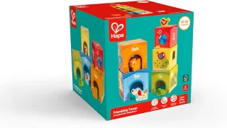 Set de cubos apilables Hape con divertidos animales y nombres. - Incluye los cubos 'Dante', 'Pepe', 'Tito' y uno superior con un pájaro. - Diseños coloridos con escenas de animales. - Fabricados en madera. En muy buen estado