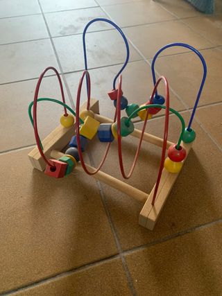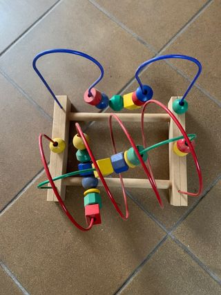 Juego de motricidad fina de madera, ideal para el desarrollo infantil. - Base de madera. - Alambre con cuentas de colores. - Diseño tipo laberinto.