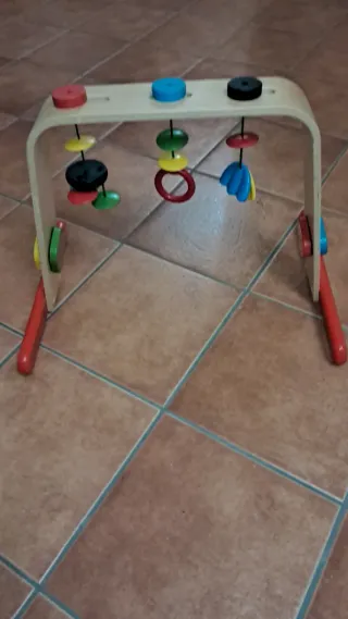 Gimnasio de actividades de madera para bebés de Ikea. Fomenta el desarrollo y la diversión. Es ideal para practicar el reconocimiento visual y la coordinación de ojos y manos. - Estructura de madera natural. - Incluye varios juguetes colgantes de colores. - Base estable para mayor seguridad.