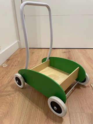 Carro de madera tipo andador de ikea, con ruedas regulables para cuando empiezan hacer sus primeros pasos que no se embale. Luego también sirve como almacenamiento de juguetes, libros, etc. muy decorativo