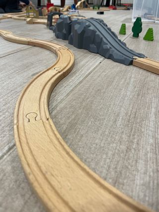 Son más de 130 piezas vías y accesorios para tren de madera, combinando piezas de Ikea y Lidl. Ideal para crear circuitos. - Vías de madera. - Accesorios de montaña y árboles.