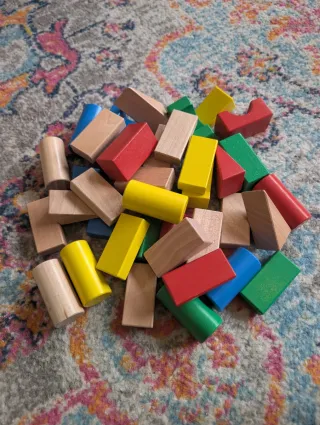 Set de bloques de construcción de madera de Ikea. Incluye piezas de diferentes colores y formas para crear diversas estructuras. - Bloques de madera natural. - Piezas de colores: rojo, amarillo, azul y verde. - Formas variadas: rectangulares y cilíndricas.