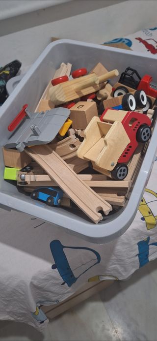 Conjunto de juguetes de madera. Circuitos de ikea, un extra y tren con bloques. Nuevo 90€.