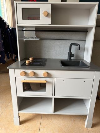 Cocinita de madera de IKEA, usada, pero muy bien cuidada. La vendo con todos los accesorios. Frutas, verduras, tostadora, batidora braun, carrito de compra, cesta de compra y menaje de cocina. - Diseño de madera. - Incluye accesorios como microondas, horno y fregadero. - Colores neutros y diseño moderno.