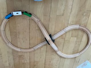 Circuito de tren de madera de IKEA con forma de ocho. - Piezas de madera para construir el circuito. - Incluye un puente negro para cruzar las vías y locomotora eléctrica. Falta un vagón rojo