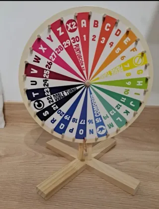 Ruleta educativa de madera con letras y números, ideal para el aprendizaje. - Incluye letras del abecedario. - Contiene números del 1 al 30. - Dispone de casillas especiales como Puntuación x2, Doble Turno, Pierde Turno y Comodín. - Diseño colorido y atractivo. Para realizar actividades educativas tanto en colegio como en casa. Similar a ruleta ikea