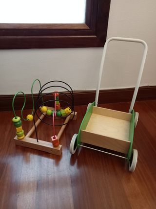 Lote de juguetes compuesto por: - Laberinto juguete de madera Montessori de Ikea, modelo Mula. Para desarrollar la psicomotricidad fina. - Andador de madera y metal de Ikea, modelo Mula. Para desarrollar la psicomotricidad gruesa. Medidas: Longitud: 40 cm Ancho: 30 cm Altura: 46 cm