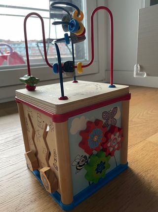 Cubo de actividades de madera con diseño de caracol y mariquita. - Incluye reloj con manecillas. - Números de colores para aprender. - Material de madera resistente.