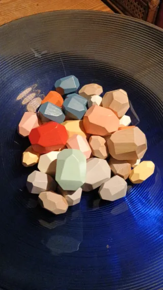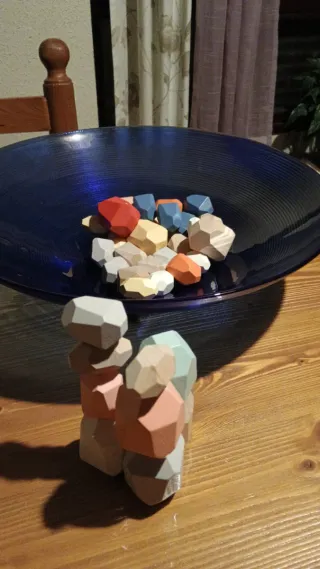 Juego de bloques de construcción de madera con un diseño inspirado en la naturaleza. - Piezas de madera con formas geométricas. - Colores pastel variados: rosa, azul, verde, naranja, beige y rojo. - Acabado suave al tacto.