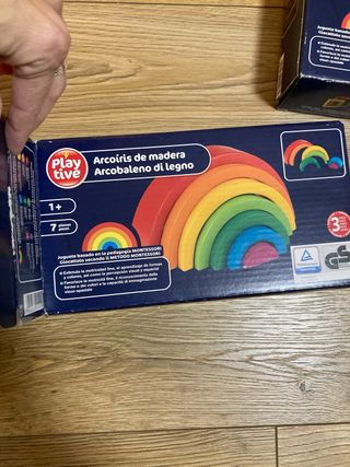 Juguete educativo basado en la pedagogía Montessori, ideal para estimular la motricidad fina y el aprendizaje de formas y colores.NUEVO CON CAJA E INSTRUCCIONES - Arcoíris de madera. - 7 piezas. - Fomenta la percepción visual y espacial. - Estimula la motricidad fina. - Ayuda al reconocimiento de formas y colores.