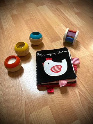 Conjunto de juguetes para bebé. - Libro de tela de contrastes, en rojo, negro, blanco. Al manipularlo hace un suave sonido de crujido. - Tres tente tiesos de madera (rojo, amarillo, azul) cada uno con un estímulo diferente (tacto, vista y sonido) - Un sonajero que rueda con una bolita de madera dentro.