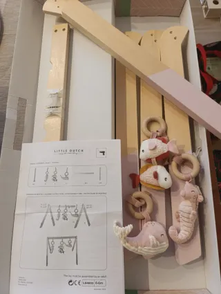 Gimnasio bebé Little Dutch de madera, en color rosa y madera natural. Incluye tres juguetes colgantes: caballito de mar, dos peces y una ballena. Está en muy buen estado. - Estructura de madera triangular. - Tres juguetes de tela colgantes. - Colores rosa y madera natural.