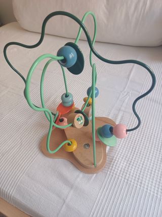 Divertido laberinto de cuentas de madera para los más pequeños. Fomenta la motricidad fina y la coordinación. - Base de madera con diseño colorido, y ruedas para poder jugar a arrastrar. - Cuentas de madera de diferentes formas (coches, barcos, tren, estrellitas) y colores. - Alambre metálico resistente y seguro.