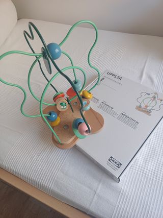 Gimnasio de actividades de madera para bebés de Ikea. Ideal para estimular el desarrollo. - Estructura de madera natural. - Incluye varios juguetes colgantes de colores. - Diseño seguro y estable.