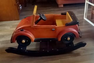 Coche de madera , es un balancín, puede servir como juego para un niño, o simplemente como decoración, mide aproximadamente 88cm ×44cm, no se ha usado, solo ha estado como decoración en la habitación de un bebé, le faltan los dos espejos de madera, pero porque yo lo sé, porque no se nota nada, se entrega en persona, sobre todo por el peso, al ser de madera maciza pesa mucho.