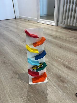 Juguete de madera hecho a mano, ideal para el desarrollo de los más pequeños. - Diseño colorido con rampas. - Piezas de madera pintadas en rojo, naranja, amarillo, azul, turquesa, verde y dos rojas. - Base de madera estable. - Dos coches pequeñitos.