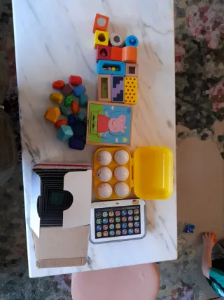 Lote variado de juguetes para niños a partir de 24 meses. Incluye bloques de construcción de madera, un puzzle de Peppa Pig, un juguete electrónico tipo tablet y otros accesorios. - Bloques de construcción de madera de diferentes formas y colores. - Puzzle de madera con Peppa Pig. - Juguete electrónico interactivo. - Huevos de juguete. - Caja de almacenamiento amarilla. NO FALTA NINGUNA PIEZA