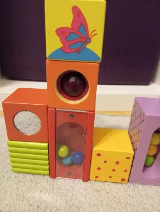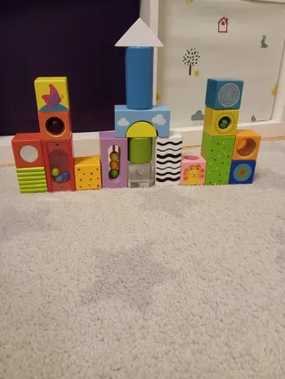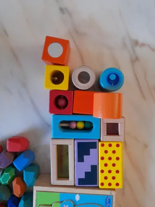 Conjunto de bloques sensoriales de madera para bebés y niños pequeños. Fomentan el desarrollo de la motricidad fina y la exploración. - Diseños variados con diferentes texturas y colores. - Incluyen elementos como cascabeles y espejos. - Material de madera resistente y seguro.