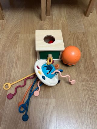 Lote de juguetes para bebés, ideal para estimular el desarrollo. - Juguete para el agua tipo pulpo con tentáculos que gira en algua. No es ruidoso y el movimiento es suave. - Caja de madera montessori con pelota roja para poner en el cajón y sacar. - Juguete sensorial con diferentes texturas y posibilidades para estimular al niño.