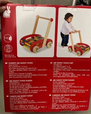 Carrito de actividades de maders es perfecto para los niños que ya andan y quieren divertirse llevandose consigo sus cosas. Hay 30 cubos de madera del alfabeto en letras minúsculas y mayúsculas y de los números. A partir de 1 año