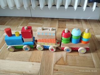 Juego de construcción de tren de madera. - Piezas de madera de diferentes formas y colores. (Están TODAS las piezas. En la foto falta una pero apareció después). - Incluye vagones y accesorios para construir un tren. - Diseños de estrellas y cuadros en algunas piezas.