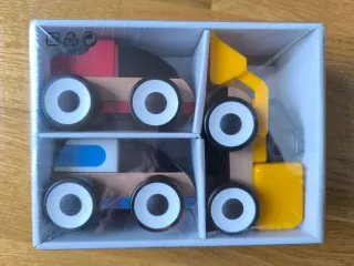 Set de coches de madera para niños de Ikea. Incluye un camión de policía, bomberos y excavadora. - Fabricados en madera. - Diseño colorido y atractivo.