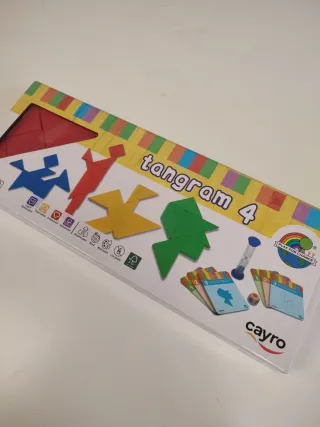 Juego de mesa Tangram 4 de la marca Cayro. Fomenta la creatividad y la resolución de problemas. - Piezas de madera. - Incluye tarjetas con figuras para construir. - Ideal para niños y adultos. Nuevo