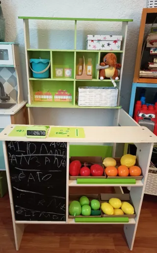 Divertido juego de frutería de juguete para niños. Incluye varios accesorios para horas de diversión. - Estructura de madera con estantes. - Pizarra para escribir. - Frutas y verduras de plástico. - Accesorios de cocina como cubos y botellas.