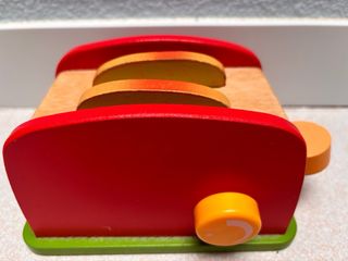 Juguete de madera con forma de tostador. - Diseño colorido con detalles. - Incluye rebanadas de pan de juguete.