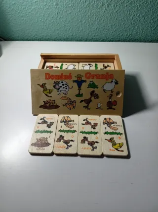 Juego de mesa Dominó Granja con divertidos dibujos de animales de granja. - Caja de madera. - Piezas de dominó con ilustraciones de animales de madera.