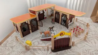 Conjunto de establo de caballos de juguete, hecho en madera, perfecto para horas de diversión. - Fabricado en madera. - Incluye vallas y obstáculos para caballos. - Varias casetas para los caballos. Se encuentra en muy buen estado.