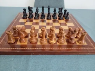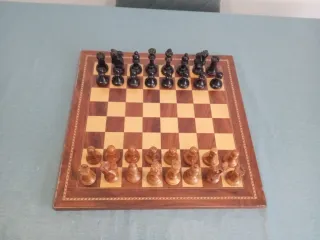 Tablero de ajedrez de madera con piezas incluidas. El tablero mide 40 x 40 y la altura del rey es de 7 CMS. Es de los años 50. El tablero tiene signos de desgaste ( ver fotos ) por los años que tiene. Las piezas están perfectas. Sin plomar.
