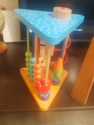 Juguete de madera con cuentas de colores para el desarrollo infantil. - Diseño triangular con base de cuentas. - Piezas de madera con formas y colores variados. - Incluye un ábaco con cuentas rojas, blancas, verdes y azules.