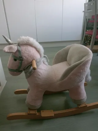 Un adorable balancín con forma de unicornio, perfecto para los más pequeños. Su suave acabado rosa lo hace muy atractivo. - Diseño de unicornio. - Color rosa. - Base de balancín de madera.