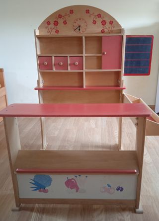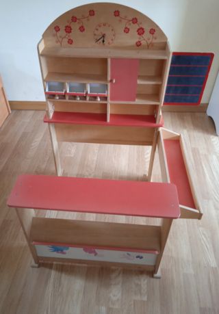 Tienda o supermercado de madera de juguete. Como se ve en las fotos. Sin accesorios. Tiene pizarra, cajones y estantes. Se ha usado bastante pero todavía está en buen estado. Nueva vale 90 euros. No hago envíos.