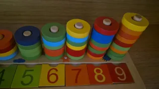 Juguete educativo de madera con fichas de colores y números. - Base de madera con números del 0 al 9. - Fichas de colores para apilar y contar. - Diseño de barras de colores apilables.