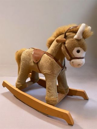 Caballo de peluche con balancín de madera. - Peluche suave de color camel. - Crin y cola blancas. - Silla de montar y riendas de cuero sintético. - Asas de madera. - Estribos metálicos.