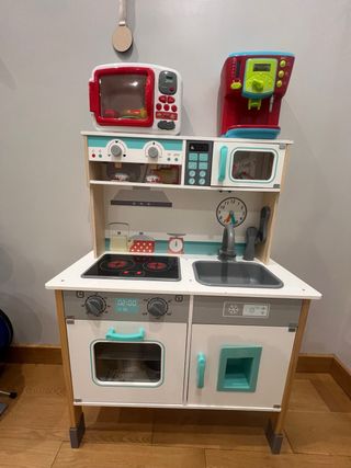 RECOGER EN PERSONA. NO SE HACEN ENVÍOS Preciosa cocinita de juguete en perfecto estado, lista para que los más pequeños se diviertan cocinando. Incluye todos sus accesorios. - Diseño moderno y colorido. - Materiales de madera resistentes. - SE REGALA microondas y cafetera