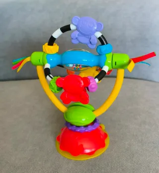 Juguete de la marca Playgro diseñado especialmente para fijarse en la bandeja de la trona o en cualquier superficie lisa gracias a su potente ventosa. - Entretenimiento total: Tiene una rueda que gira 360°, cuentas de colores que hacen sonido de sonajero, cintas de texturas y animalitos. - Estimulación sensorial: Ayuda al bebé a desarrollar la motricidad fina y la coordinación ojo-mano mientras espera su comida. - Seguro y práctico: Se limpia fácilmente con un paño húmedo. - Estado: Muy bien cuidado, funciona perfectamente y mantiene todos sus colores vibrantes. - Ideal para bebés a partir de +6 m Se entrega desinfectado.