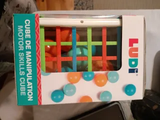 Cubo de manipulación Ludi para bebés a partir de 10 meses. Fomenta el desarrollo de las habilidades motoras. - Diseño colorido con cuerdas elásticas. - Incluye varias pelotas de diferentes colores. Las pelotas tienen algo dentro( tipo maraca) Juguete bebé Oculo manual Desarrollo bebé Estimulación temprana . No lo hemos abierto, regalado estas fiestas