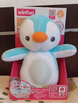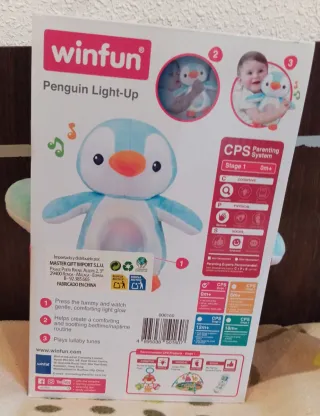 Con el pingüino WinFun musical, su bebé dormirá suavemente. Presiona el vientre para escuchar sonidos relajantes de la naturaleza, los pájaros y las melodías dulces y canciones de cuna para que el bebé cree una rutina de sueño. El pingüino es rosa y la tripita emite suaves luces de colores mientras suenan las canciones. Su textura es tan suave que ayuda a reducir el estrés en los niños. El proveedor WinFun favoreciendo la memoria y la estimulación sensorial. Medidas 22x10x25 Funciona con 2 pilas AA Sin abrir