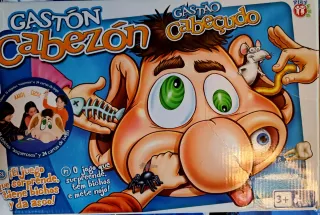 Juego Gaston Cabezón Juego de mesa interactivo para niños a partir de 3 años, enfocado en la estimulación táctil y la rapidez. Los jugadores deben introducir la mano en la cabeza de Gastón para encontrar objetos "asquerosos" (moquitos, arañas, comida podrida) que coincidan con su carta, ganando quien consiga más cartas.